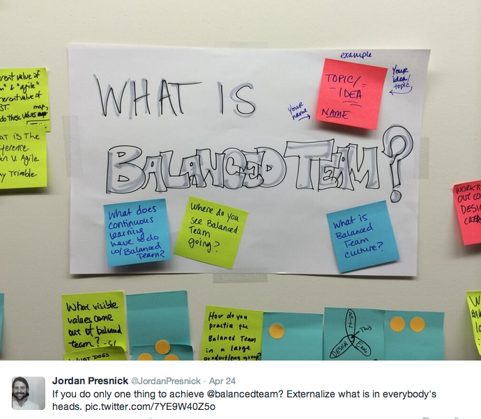 The question that received the most dot clusters was the topic on everyone’s tongues: How does Balanced Team fit into organizations: top down or bottom up? For those of us that have confronted this problem, it was easy to surface the issues and throw around some stories of experiences and the learning that was captured from them. The one truth that we can all agree on is that it is invariably hard but always worthwhile. As to be expected, the secondary and perhaps more important component of the event was the time available for old friends to reconnect and talk about their work and passions.